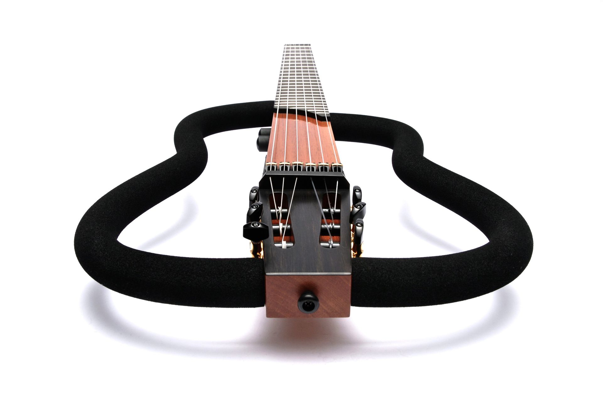 Ich selbst spiele dieses Instrumen in einer 7-saitigen Variante. Das Instrument hat mich zu vielen Kompositionen und Bearbeitungen inspiriert. Die FRAME GUITAR besteht aus einem durchgehenden Hals mit zwei abnehmbaren Seitenteilen, den so genannten Frames ... Die Saiten werden an einem Saitenhalter am Ende des Griffbretts befestigt, dort wo sich normalerweise der Kopf befindet. Unterhalb des Steges befindet sich die Kopfplatte mit den Stimm Mechaniken. Beide haben also Ihren Platz getauscht.
